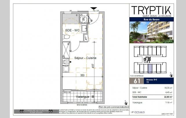 iad France - Joël DENAGE (06 92 73 92 03) vous propose : Dans la future résidence TRIPTIK, cet appartement d’étudiant de 22,80m2 environ avec une petite varangue, située à 400m du campus du Moufia, principal pôle universitaire de la REUNION.